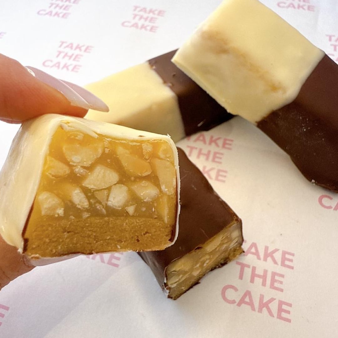 Para disfrutar sin culpa llego el sniker a Take The Cake, la famosa barra cubierta de chocolate 70% sin azúcar (blanco y negro) con interior de caramelo y maní, sobre una base de nougat proteico!
